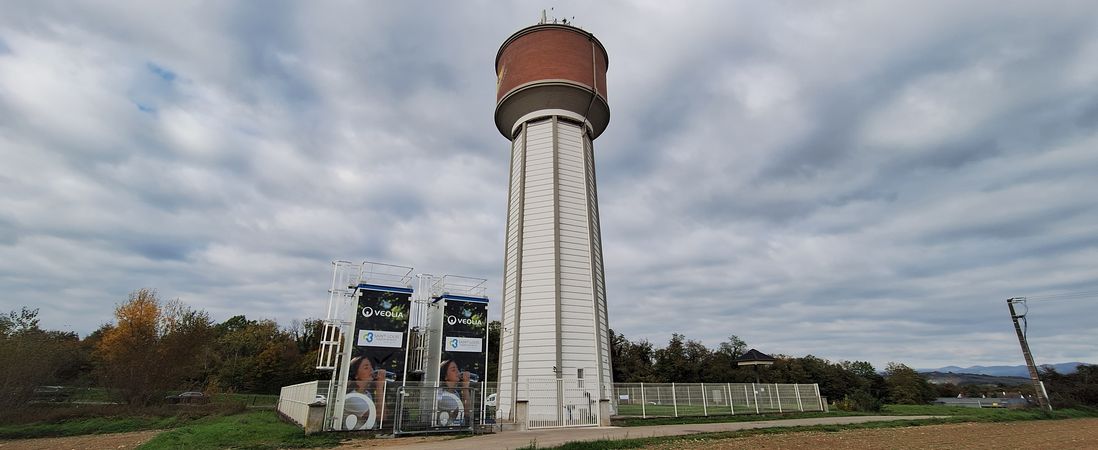 Photo en-tête : Château d’eau de Bartenheim avec deux unités mobiles de filtration au charbon actif.