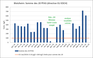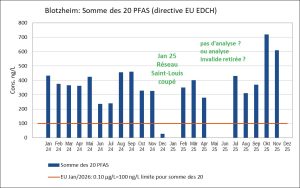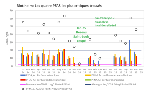 Par exemple, l’eau souterraine captée à Saint-Louis Neuweg et distribuée à Blotzheim est fortement polluée. L’eau du robinet a encore atteint des sommets : 720 ng/L, soit 7,2 x la limite réglementaire. Problème, les PFAS s’accumulent dans notre organisme et ne sont que très lentement éliminés.