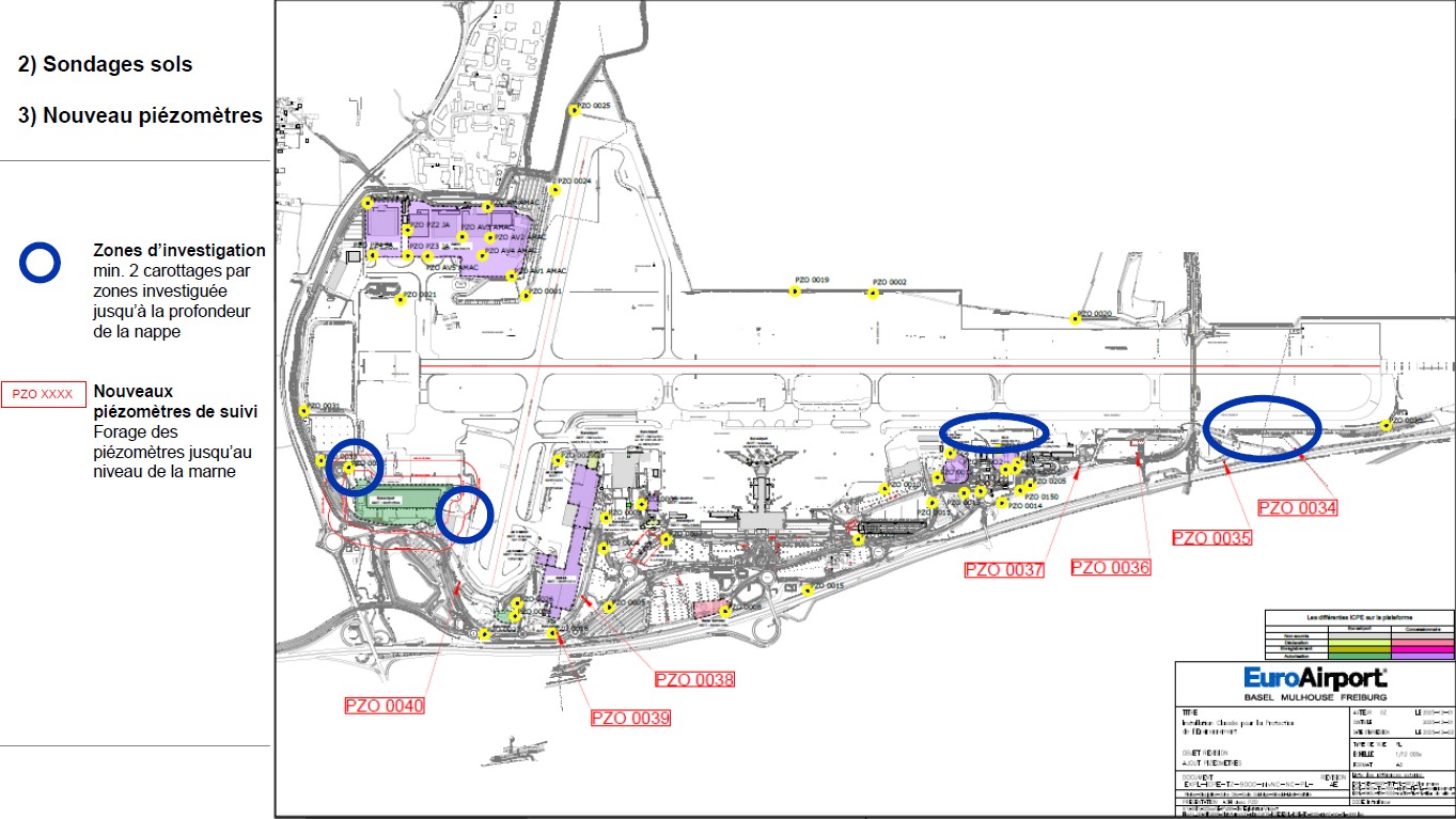 Voir le schéma de la carte détaillée des sondages effectués dans les sols pollués de l’Euroairport.